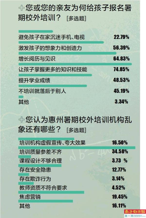 惠州暑期校外培训机构乱象还有哪些?南都记者问卷调查发现,受访者认为惠州暑期校外培训机构乱象主要有“培训质量参差不齐”“培训机构虚假宣传、夸大效果”“焦虑营销”。有一些家长反映,报名的时候觉得机构夸大效果,觉得孩子学了一段时间,收获不大。三成受访者表示曾经遇到过不同种类的乱象。