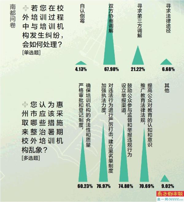 “若您在校外培训过程中与培训机构发生纠纷,会如何处理”,南都问卷调查中,67.98%受访者选择“双方协商调解”,有两成家长表示会“寻求第三方调解”。吴女士称,此前给孩子报的培训机构搬迁了新址,有装修味道,怕对孩子健康有影响,就与对方协商,最后机构同意延迟了上课期限。