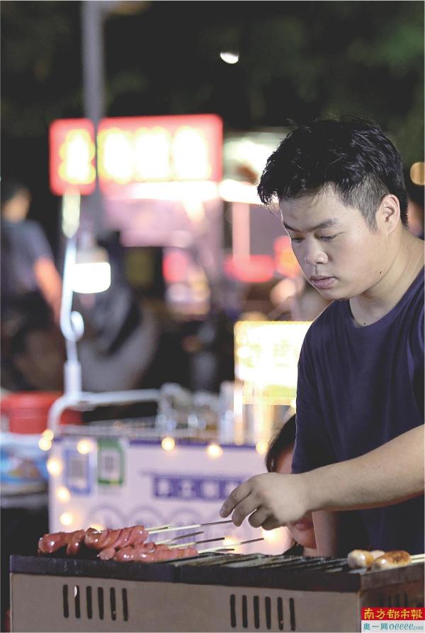 鹿江沥湿地公园夜市,一位摊主正在烤肠。