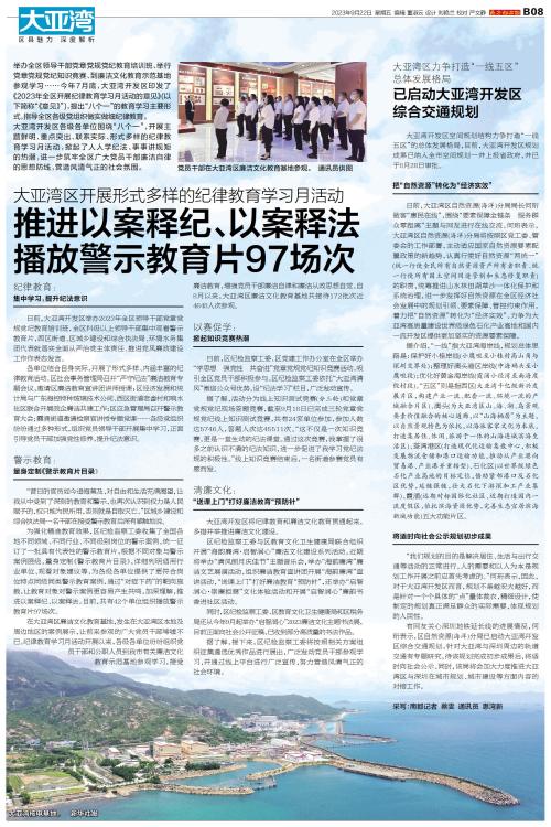 举办全区领导干部党章党规党纪教育培训班、举行党章党规党纪知识竞赛、到廉洁文化教育示范基地参观学习……今年7月底,大亚湾开发区印发了《2023年全区开展纪律教育学习月活动的意见》(以下简称“《意见》
