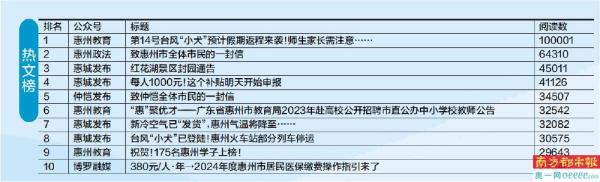 “惠州教育”发布的《第14号台风“小犬”预计假期返程来袭!》,该篇内容详细地介绍了台风“小犬”移动路径以及影响,受到了师生以及家长关注,成为10月热文榜唯一阅读量达到10万+的推文。