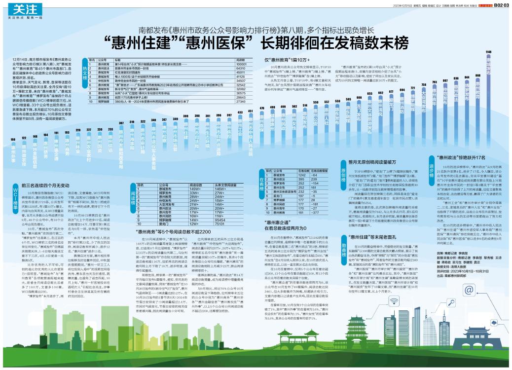 12月14日,南方都市报发布《惠州政务公众号影响力排行榜》(第八期),对“惠城发布”“惠州教育”等45个惠州市直部门、各县区融媒体中心的政务公众号影响力进行客观评测、排名。