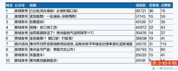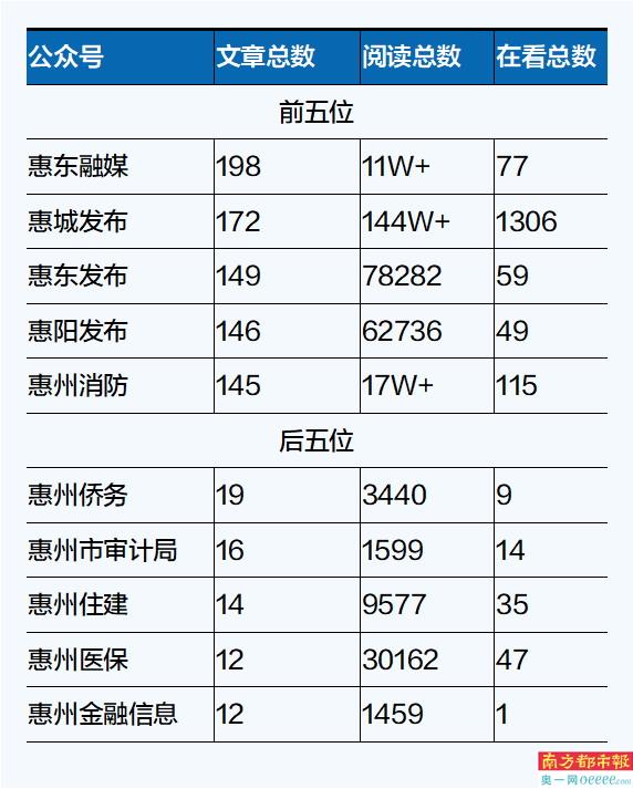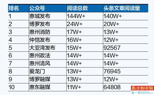 位居阅读榜前五名的另外三位分别为“惠州消防”“仲恺发布”“大亚湾发布”,阅读总量分别为17万+、16万+、15万+。