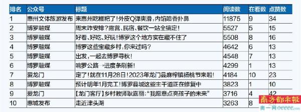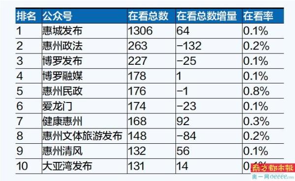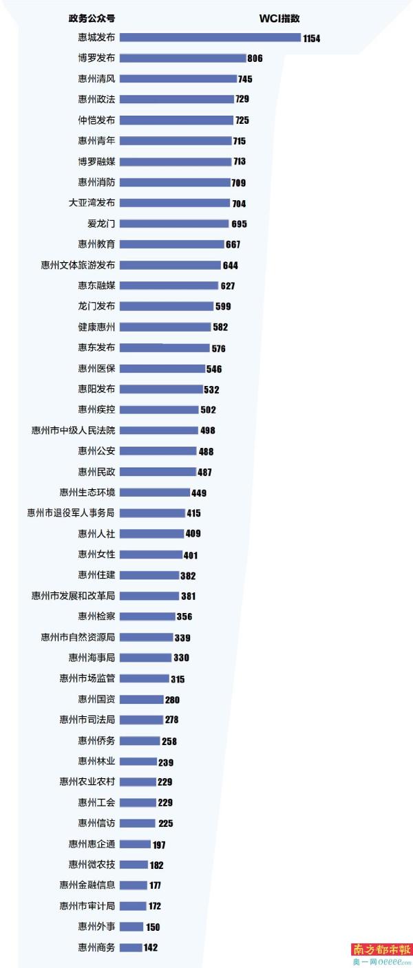 1月12日,南方都市报发布《惠州政务公众号影响力排行榜》(第九期),对“惠城发布”“惠州教育”等45个惠州市直部门、县区融媒体中心的政务公众号影响力进行客观评测、排名。榜单显示,“惠城发布”“博罗发布”“惠州清风”排在2023年11月微信传播指数(WCI)榜单的前三位。