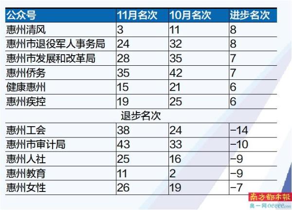 “惠州工会”“惠州市审计局”“惠州女性”在上一期测评中,位列进步榜前五。但没想到,在本期的测评中,“惠州女性”“惠州教育”“惠州人社”“惠州市审计局”“惠州工会”排在倒数5位。其中,“惠州工会”退步最为明显,退步了14名。