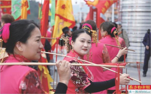 大王爷节庆祝活动中,女子身着统一的渔家服装,盘着漂亮的“仙姑髻”、插着金银头饰。 南都记者 张嘉培 摄