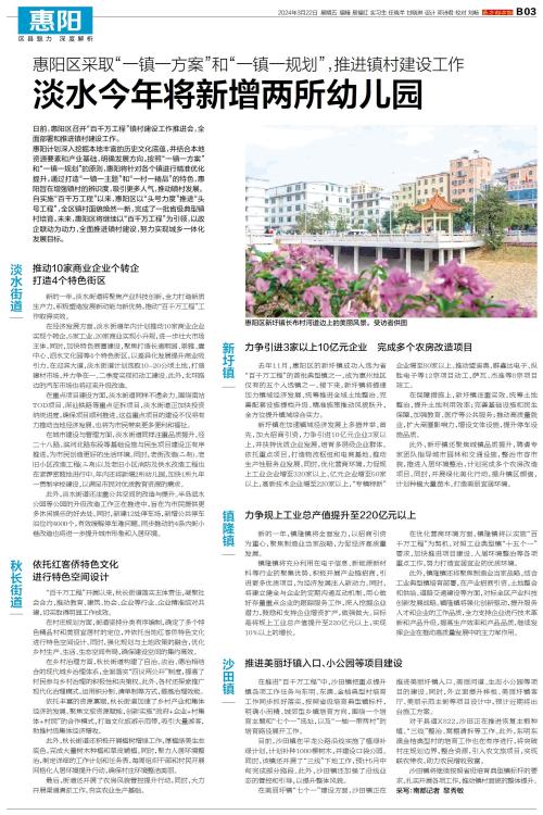 日前,惠阳区召开“百千万工程”镇村建设工作推进会,全面部署和推进镇村建设工作。 惠阳计划深入挖掘本地丰富的历史文化底蕴,并结合本地资源要素和产业基础,明确发展方向。按照“一镇一方案”和“一镇一规