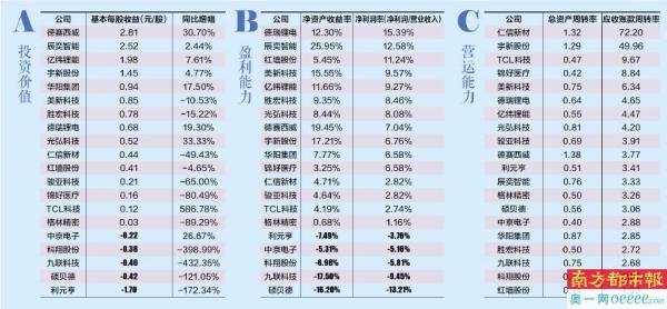 15家公司的营收均超过10亿元,TCL科技、德赛西威和亿纬锂能这3家企业的营业收入均超过100亿,TCL科技营收更是超1700亿,8家企业营收同比下降。20家企业中,5家企业出现亏损,分别是九联科技、科翔股份、利元亨、硕贝德、中京电子,其中硕贝德和中京电子已经连续两年亏损。有11家企业净利润同比下滑,超过了全部上市企业的一半,九联科技和科翔股份更是下滑了超400%。