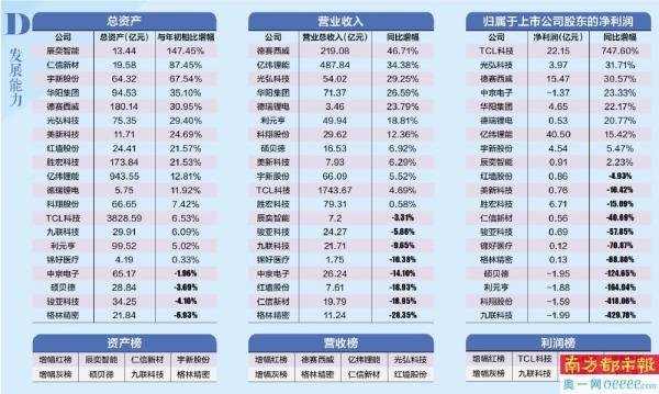在资产排行榜,4家企业的总资产超过100亿元。TCL科技和亿纬锂能是惠州仅有的两家总资产和净资产均过百亿的上市企业,TCL科技也是唯一总资产过3000亿的企业。在报告期内新增的3家上市企业辰奕智能、仁信新材和宇新股份排在总资产和净资产增幅的前三。