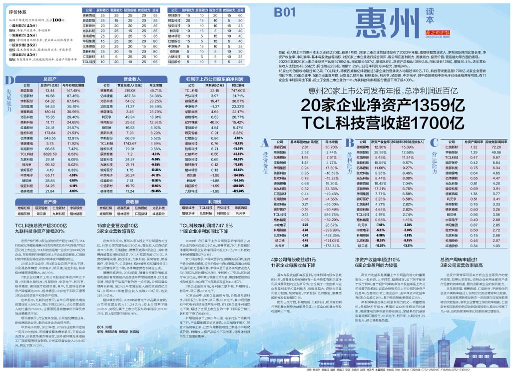 目前,在A股上市的惠州本土企业已达20家。截至4月底,20家上市企业均陆续发布了2023年年报。南都根据营业收入、净利润及其同比增长率、净资产收益率、净利润率、基本每股收益等指标,对20家上市企业