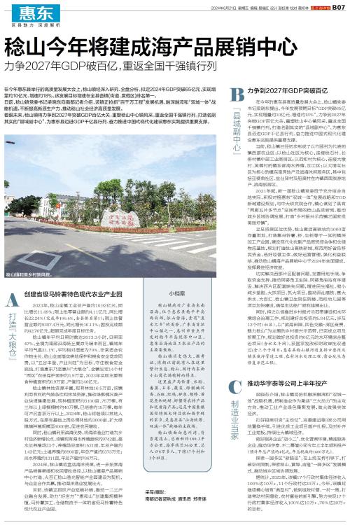 在今年惠东县举行的高质量发展大会上,稔山镇经深入研究、全盘分析,拟定2024年GDP突破65亿元,实现增量约10亿元、增速约18%。该发展目标增速在全县各镇(街道、度假区)排名第一。 日前,稔山