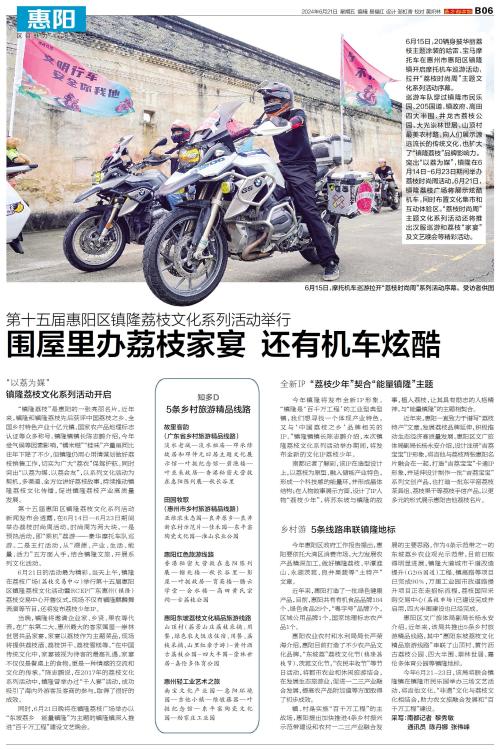 6月15日,摩托机车巡游拉开“荔枝时尚周”系列活动序幕。 受访者供图 6月15日,20辆身披华丽荔枝主题涂装的哈雷、宝马摩托车在惠州市惠阳区镇隆镇开启摩托机车巡游活动,