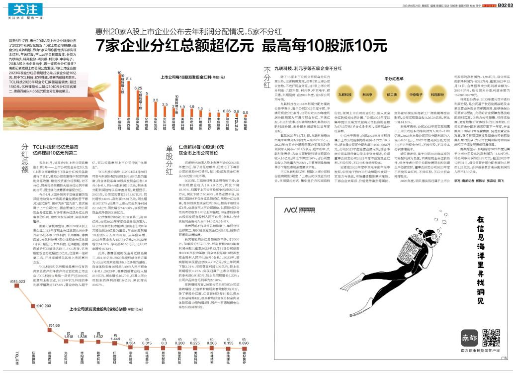 截至6月17日,惠州20家A股上市企业陆续公布了2023年利润分配情况,15家上市公司将进行现金分红或转增股。另有5家公司称因亏损不派发现金红利,不送红股,不以公积金转增股本,分别为九联科技、科翔