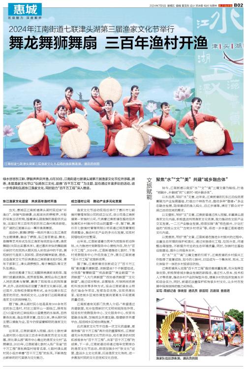绿水悠悠东江畔,锣鼓声声庆开渔。6月30日,江南街道七联津头湖第三届渔家文化节拉开序幕。据悉,本届渔家文化节以“弘扬东江文化,助推‘百千万工程’”为主题,旨在通过丰富多彩的活动,进一步传承和弘扬东