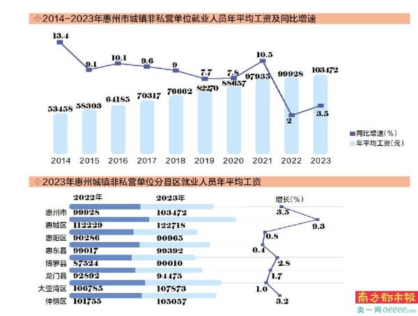 2023年,惠州市城镇非私营单位就业人员年平均工资103472元,与2022年的99928元相比,增加3544元,同比增长3.5%。其中,在岗职工年平均工资104326元,同比增长2.9%。就业人员及在岗职工年平均工资增速与2022年相比,分别上升1.5和0.8个百分点。