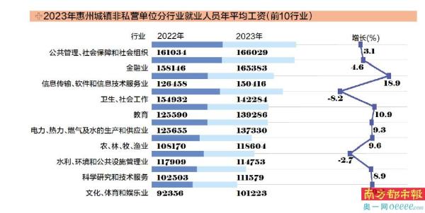 南都记者梳理发现,惠州市城镇非私营单位就业人员年平均工资10年来几乎翻一番。从县区来看,去年惠城区从业人员平均工资最高,超12万元。从行业来看,公共管理、社会保障和社会组织就业人员年平均工资最高,超过16万元。信息传输、软件和信息技术服务业平均工资增速最快,一年增长了近2.4万元。
