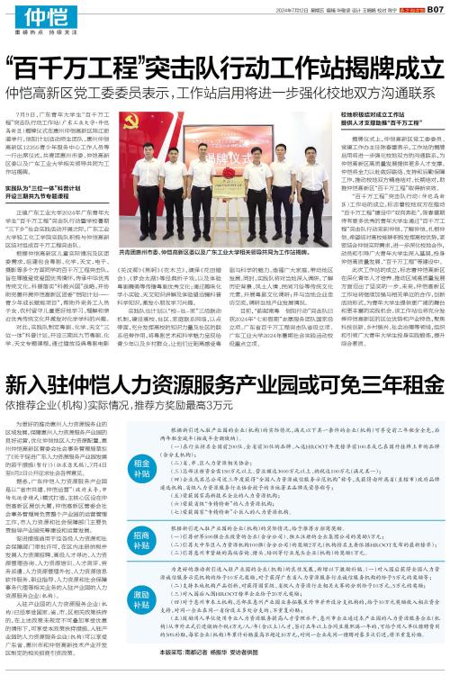 7月9日,广东青年大学生“百千万工程”突击队行动工作站(广东工业大学·仲恺高新区)揭牌仪式在惠州仲恺高新区陈江街道举行,恺阳计划活动师生团队、惠州仲恺高新区12355青少年服务中心工作人员等一行出