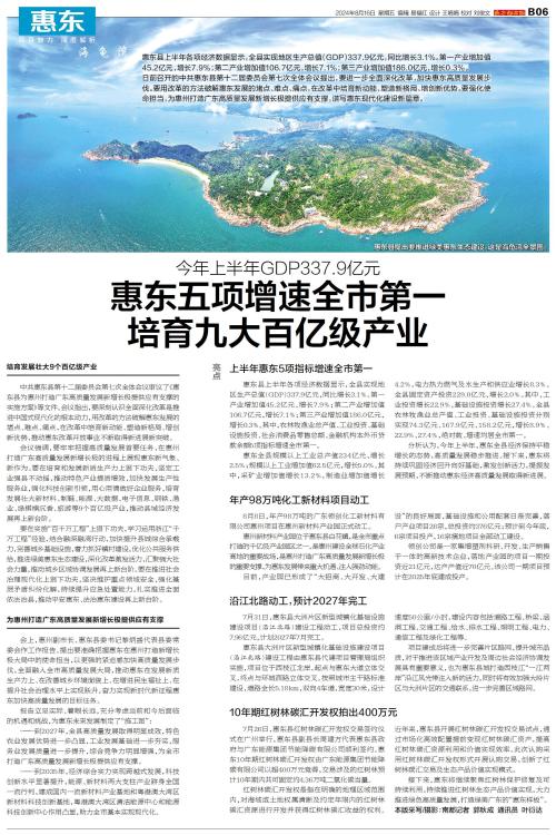 惠东县上半年各项经济数据显示,全县实现地区生产总值(GDP)337.9亿元,同比增长3.1%。第一产业增加值45.2亿元,增长7.9%;第二产业增加值106.7亿元,增长7.1%;第三产业增加值1