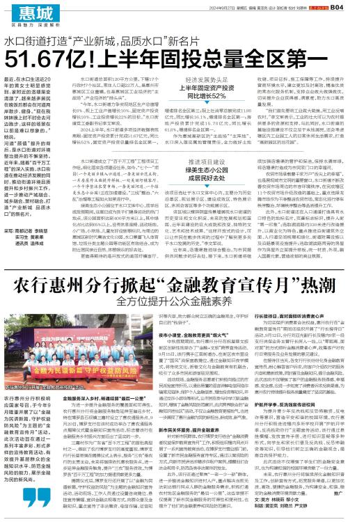 2024上半年,水口街道多项经济数据表现亮眼:固定资产投资累计完成51.67亿元,同比增长52%,固定资产投资总量排名全区第一,增速排名全区第三;限上社消零总额完成11.98亿元,同比增长16.1%,增速排名全区第一;房地产投资累计完成15.78亿元,同比增长61.8%,增速排名全区第一。
