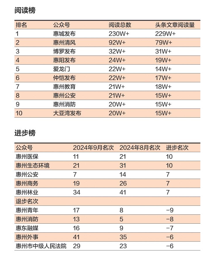 榜单中退步最大的“惠州青年”从第8名退步到第17名,共退步9个名次。8月,“惠州青年”有4篇稿件阅读量破万,最高的一篇达2.8万,9月仅两篇破万,且最高为1.2万。
