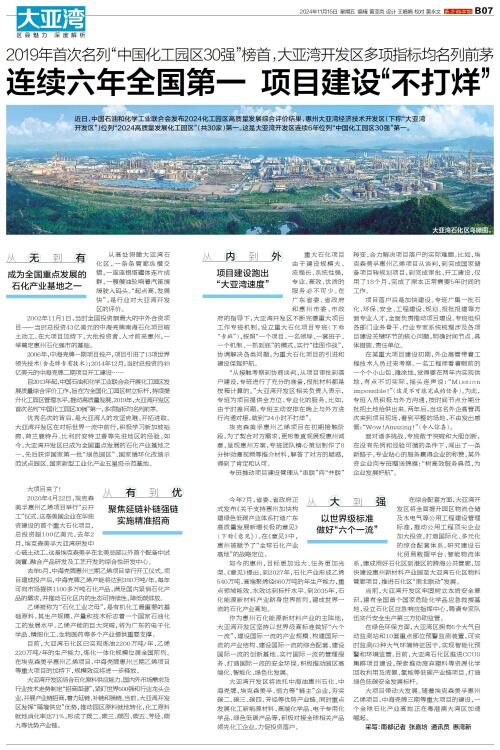 近日,中国石油和化学工业联合会发布2024化工园区高质量发展综合评价结果,惠州大亚湾经济技术开发区(下称“大亚湾开发区”)位列“2024高质量发展化工园区”(共30家)第一。这是大亚湾开发区连续6