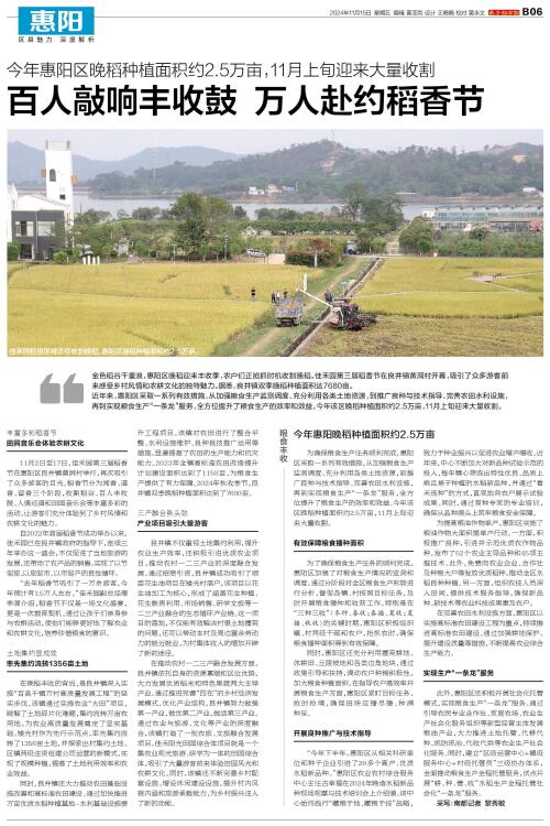 金色稻谷千重浪,惠阳区晚稻迎来丰收季,农户们正抢抓时机收割晚稻。佳禾园第三届稻香节在良井镇黄洞村开幕,吸引了众多游客前来感受乡村风情和农耕文化的独特魅力。据悉,良井镇双季晚稻种植面积达7680亩。