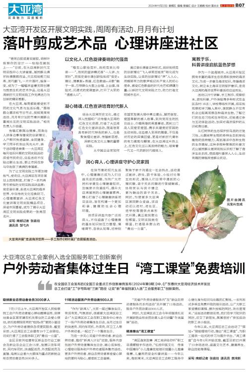 在全国总工会发布的《全国工会重点工作创新案例发布(2024年第9期)》中,《广东惠州大亚湾经济技术开发区总工会打造“工”字号阵地“三新”路径 让双“新”幸福到家》入选“工会服务职工”创新案例。