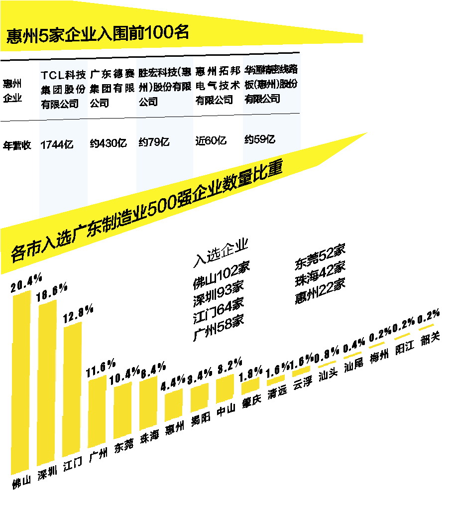 广东制造业500强企业是助力全省制造业及区域经济企稳的主力军。12月3日,广东省制造业协会、暨南大学产业经济研究院、广东省发展和改革研究院联合发布《2024年广东制造业500强企业研究报告》,惠州共有22家企业上榜,入选数居全省第七。