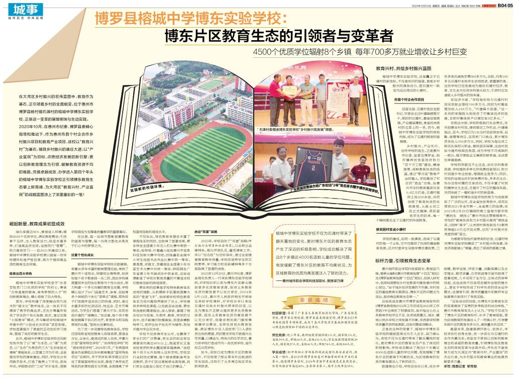 2020年10月,在惠州市纪委、博罗县委精心指导和推动下,作为惠州市首个村企合作乡村振兴项目和教育产业项目,该校以“教育兴村”为基石,铺就乡村振兴的康庄大道;以“产业富民”为目标,点燃经济发展的新引擎;更以创新教育理念为引领,破解教育资源不均的难题。凭借卓越成效,办学进入第四个年头的榕城中学博东实验学校正引领博东教育生态攀上新高峰,为大湾区“教育兴村、产业富民”的战略蓝图添上了浓墨重彩的一笔!