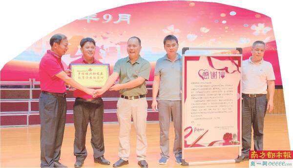 石滩村委赠送博东实验学校“乡村振兴助发展”牌匾。