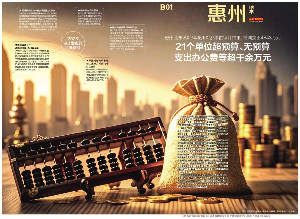 2024年12月25日,惠州市审计局在官网发布《惠州市一级预算单位2023年度预算执行和其他财政收支情况的审计结果》,市审计局于2024年3至5月对市一级预算单位2023年度预算执行和其他财政收支