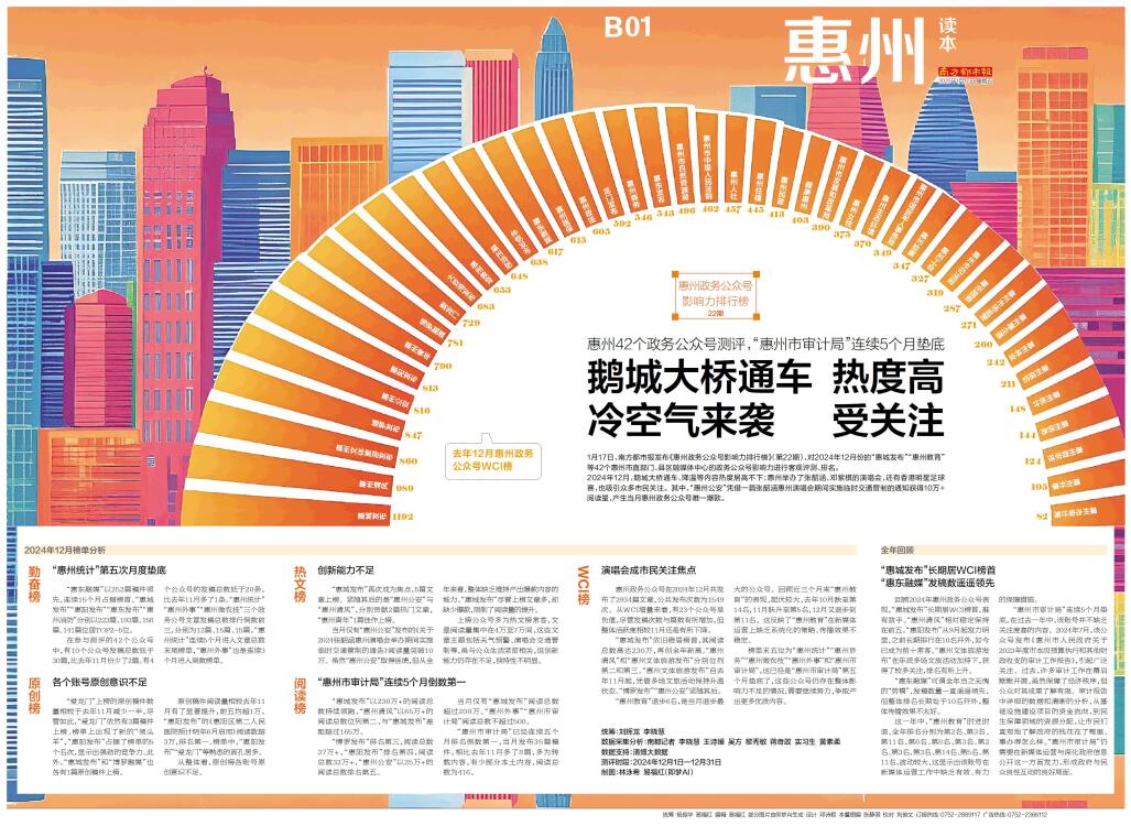 惠州政务公众号影响力排行榜 22期 1月17日,南方都市报发布《惠州政务公众号影响力排行榜》(第22期),对2024年12月份的“惠城发布”“惠州教育”