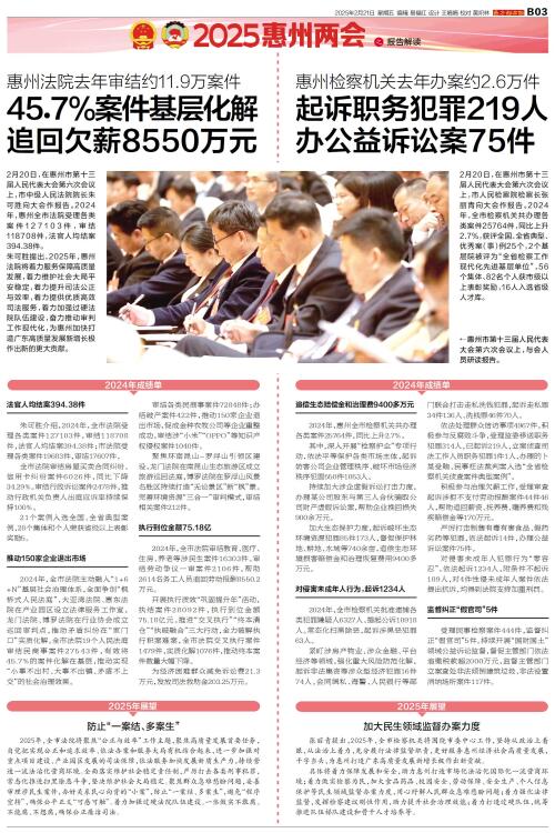 2025惠州两会之报告解读 2月20日,在惠州市第十三届人民代表大会第六次会议上,市中级人民法院院长朱可胜向大会作报告。2024年,惠州全市法院受理各类案件127103件,审结118708件,法