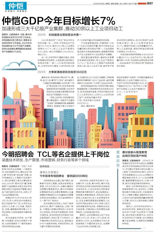 南都讯 记者杨振华 日前,惠州仲恺高新区召开2025年工作会议,仲恺高新区党工委书记、管委会主任陈东照作工作报告,2025年仲恺加速形成三大千亿级产业集群,经济社会发展主要预期目标是地区生产总值增