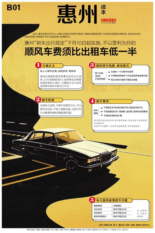近日,惠州印发《关于私人小客车合乘出行的若干规定》,明确合乘服务性质、平台责任及费用分摊标准,并划定与非法营运的界限。新规将于3月10日起实施,有效期3年。