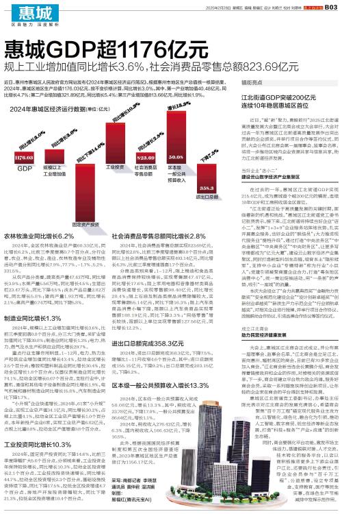 近日,惠州市惠城区人民政府官方网站发布《2024年惠城区经济运行简况》。根据惠州市地区生产总值统一核算结果,2024年,惠城区地区生产总值1176.03亿元,按不变价格计算,同比增长3.0%。其中