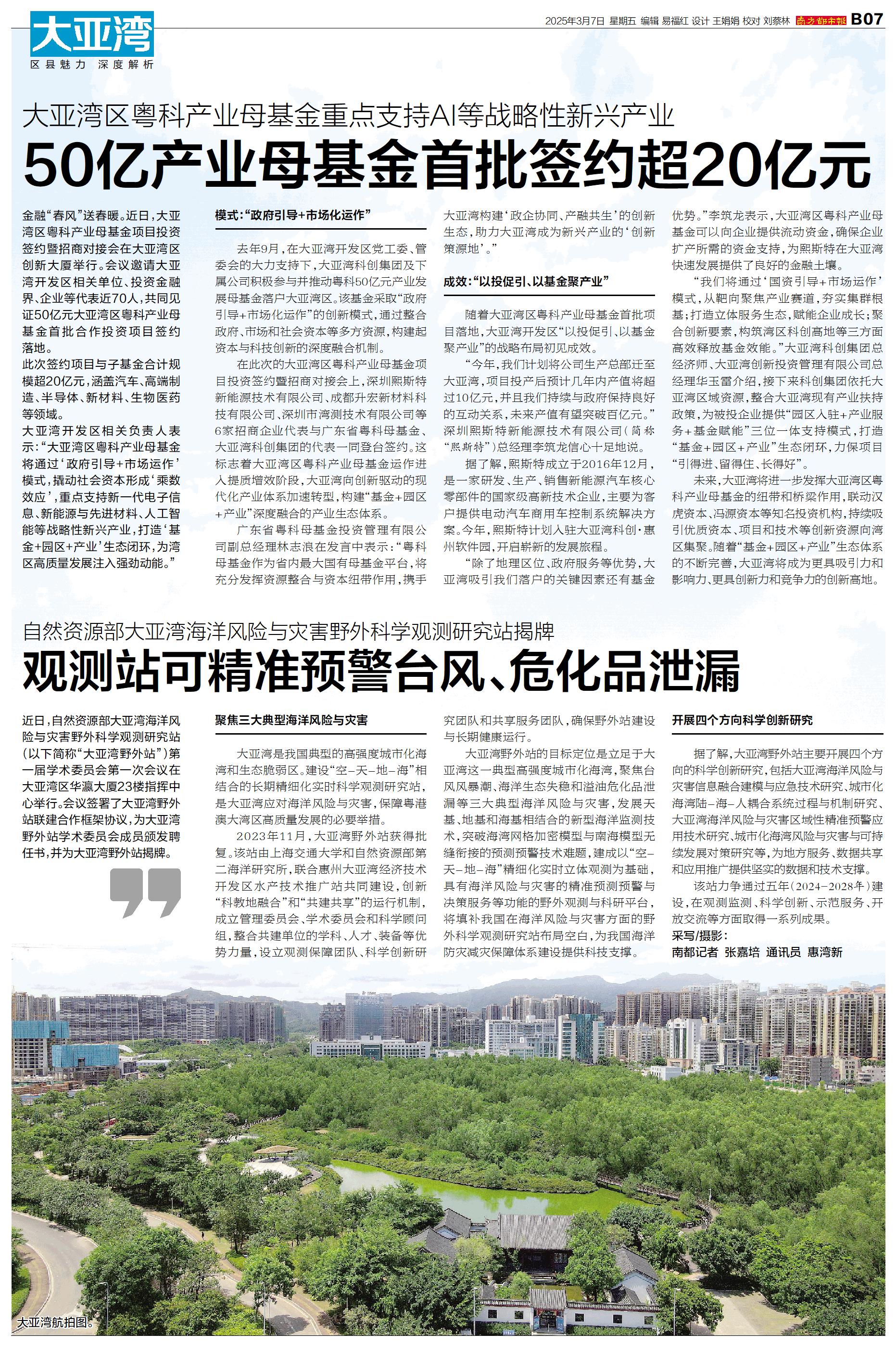 金融“春风”送春暖。近日,大亚湾区粤科产业母基金项目投资签约暨招商对接会在大亚湾区创新大厦举行。会议邀请大亚湾开发区相关单位、投资金融界、企业等代表近70人,共同见证50亿元大亚湾区粤科产业母基金