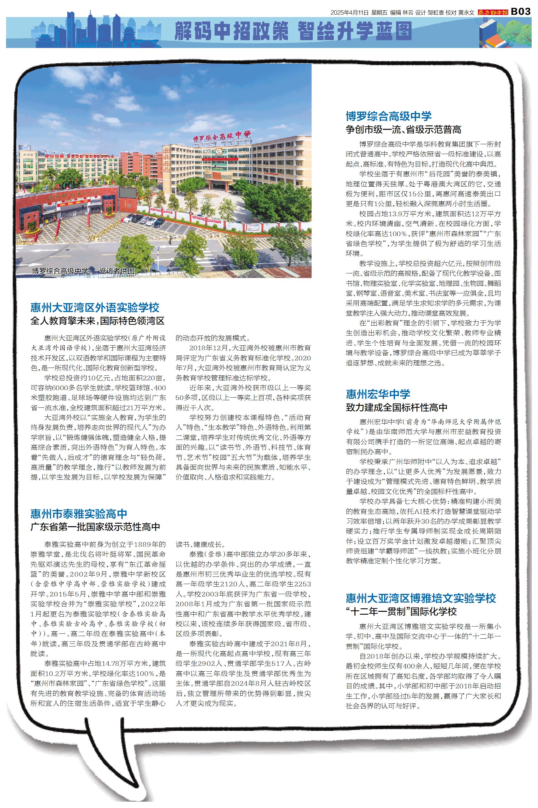 博罗综合高级中学是华科教育集团旗下一所封闭式普通高中。学校严格依照省一级标准建设,以高起点、高标准、有特色为目标,打造现代化高中典范。 学校坐落于有惠州市“后花园”美誉的泰美镇,地理位置得天独厚