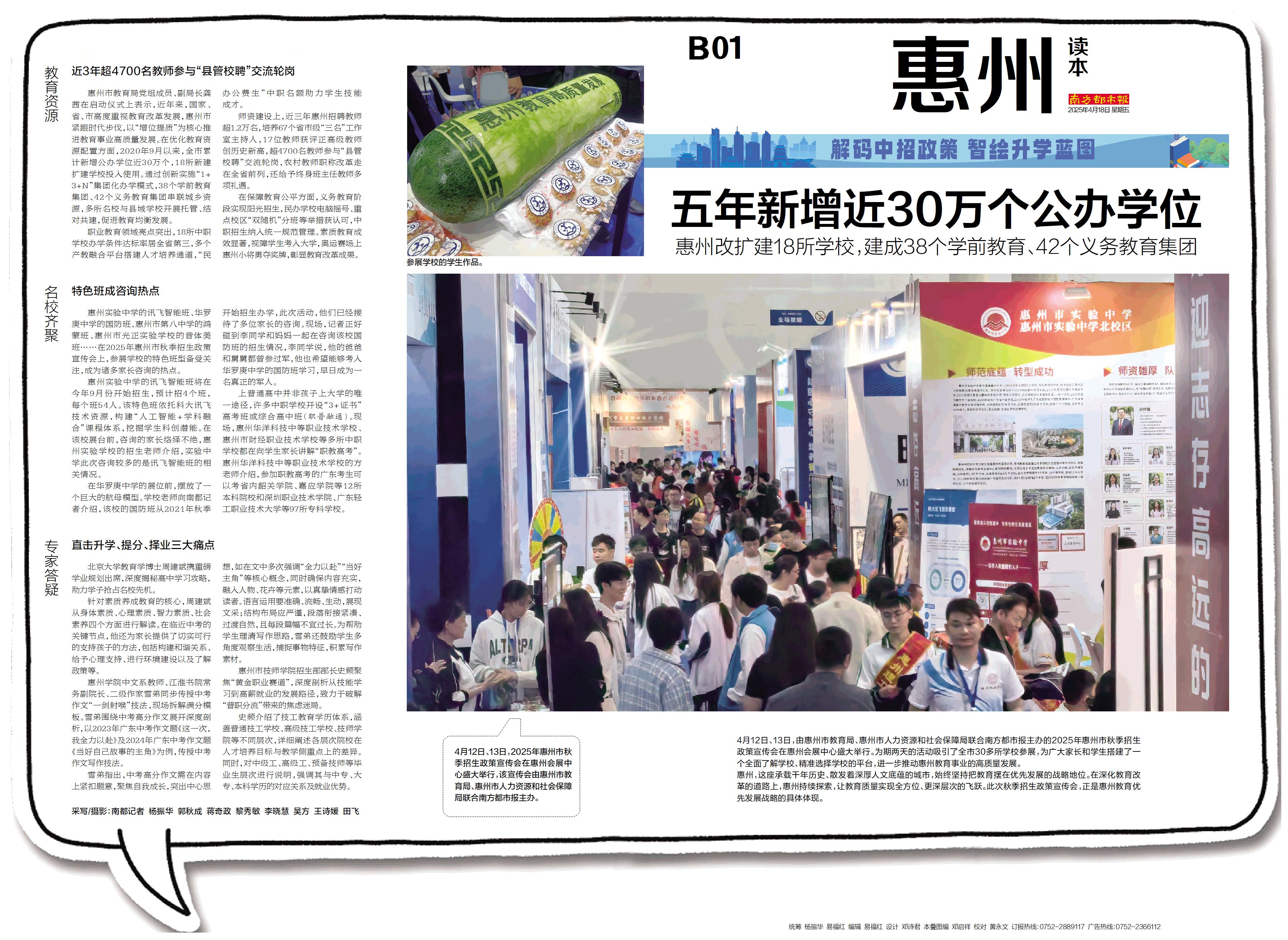 4月12日、13日,由惠州市教育局、惠州市人力资源和社会保障局联合南方都市报主办的2025年惠州市秋季招生政策宣传会在惠州会展中心盛大举行。为期两天的活动吸引了全市30多所学校参展,为广大家长和学