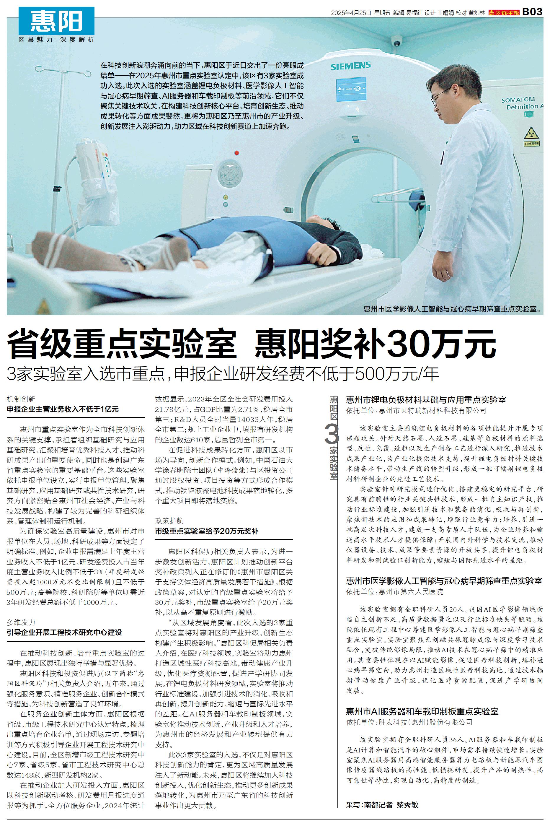 在科技创新浪潮奔涌向前的当下,惠阳区于近日交出了一份亮眼成绩单——在2025年惠州市重点实验室认定中,该区有3家实验室成功入选。此次入选的实验室涵盖锂电负极材料、医学影像人工智能与冠心病早期筛查、