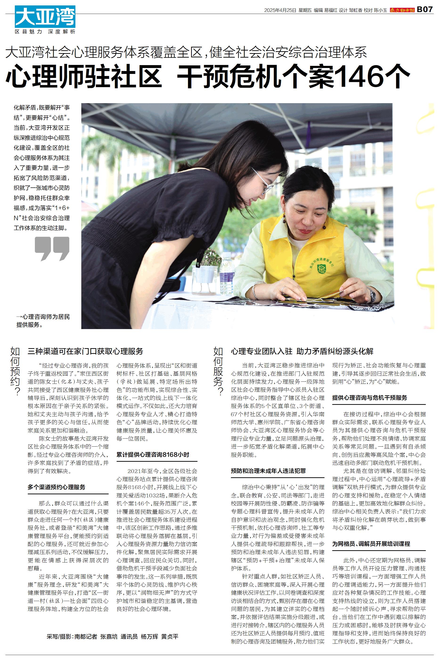 化解矛盾,既要解开“事结”,更要解开“心结”。当前,大亚湾开发区正纵深推进综治中心规范化建设,覆盖全区的社会心理服务体系为其注入了重要力量,进一步拓宽了风险防范渠道,织就了一张城市心灵防护网,稳稳