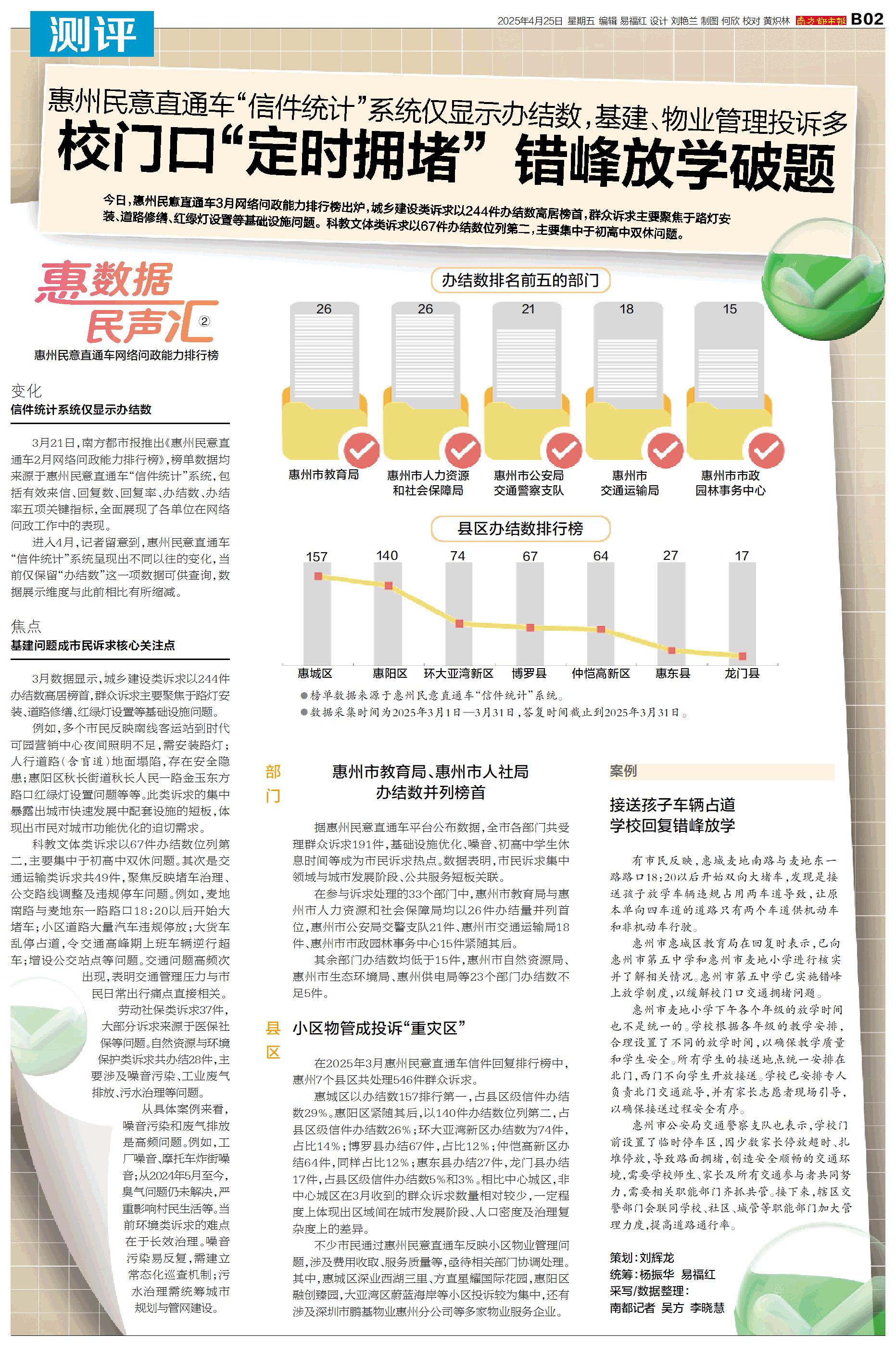 今日,惠州民意直通车3月网络问政能力排行榜出炉,城乡建设类诉求以244件办结数高居榜首,群众诉求主要聚焦于路灯安装、道路修缮、红绿灯设置等基础设施问题。科教文体类诉求以67件办结数位列第二,主要集