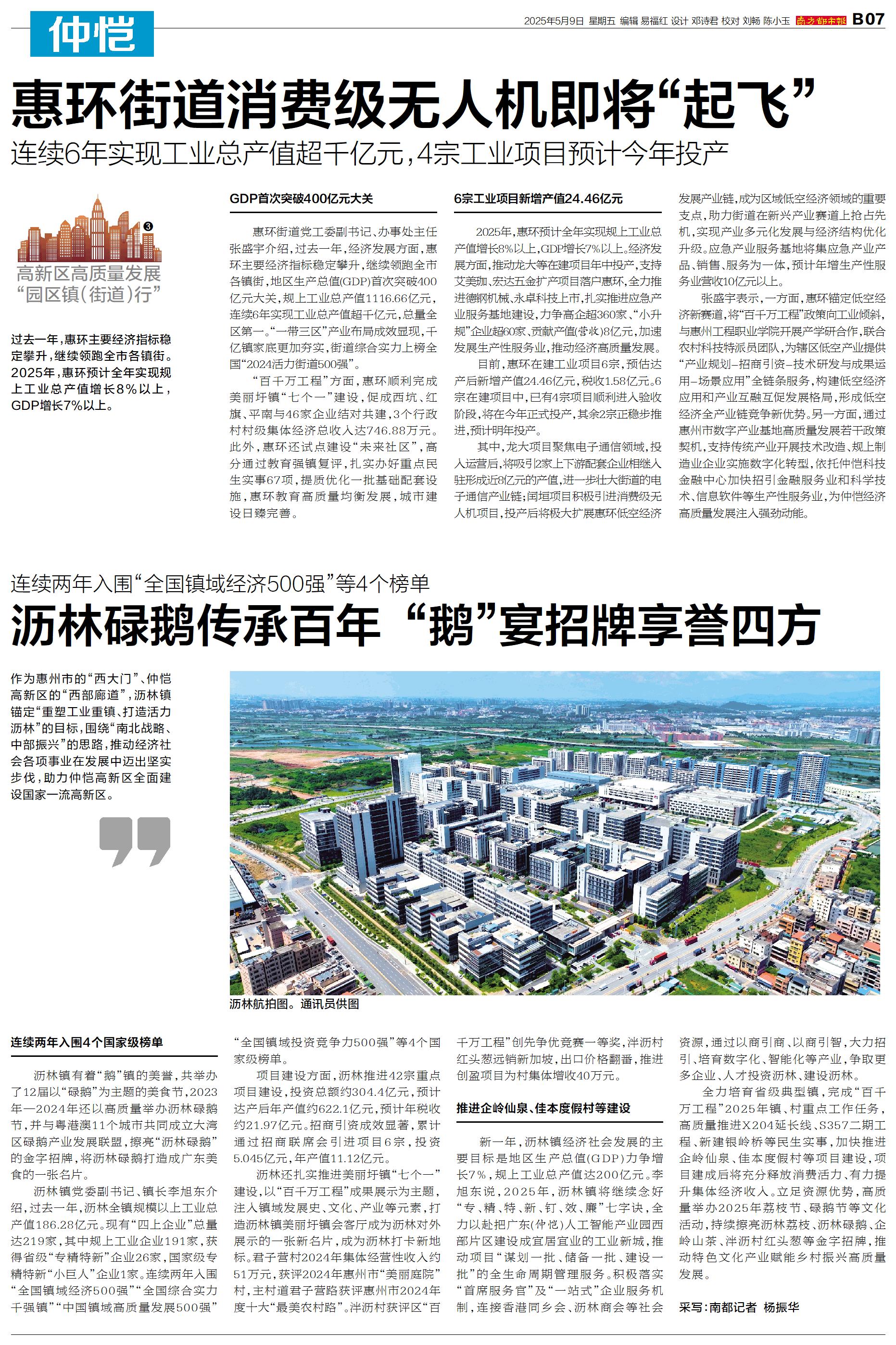 高新区高质量发展“园区镇(街道)行” 过去一年,惠环主要经济指标稳定攀升,继续领跑全市各镇街。2025年,惠环预计全年实现规上工业总产值增长8%以上,GDP增长7%以上。 GDP首次突破400