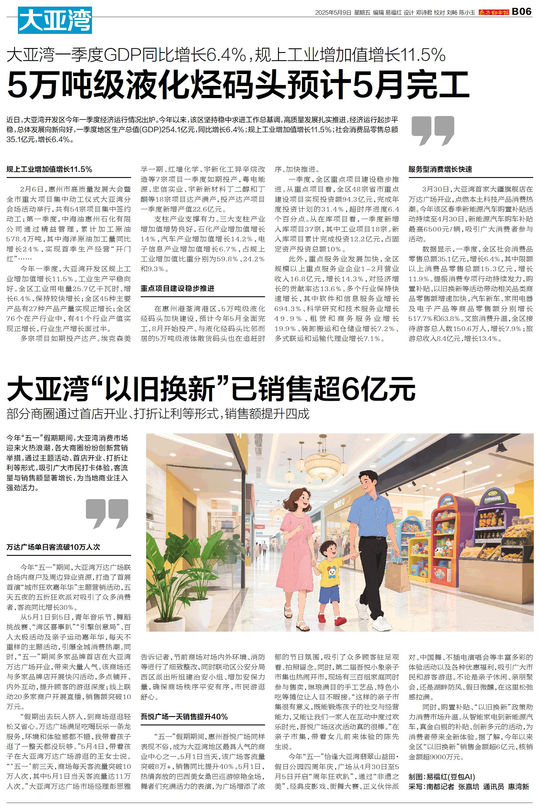 近日,大亚湾开发区今年一季度经济运行情况出炉。今年以来,该区坚持稳中求进工作总基调,高质量发展扎实推进,经济运行起步平稳,总体发展向新向好,一季度地区生产总值(GDP)254.1亿元,同比增长6.