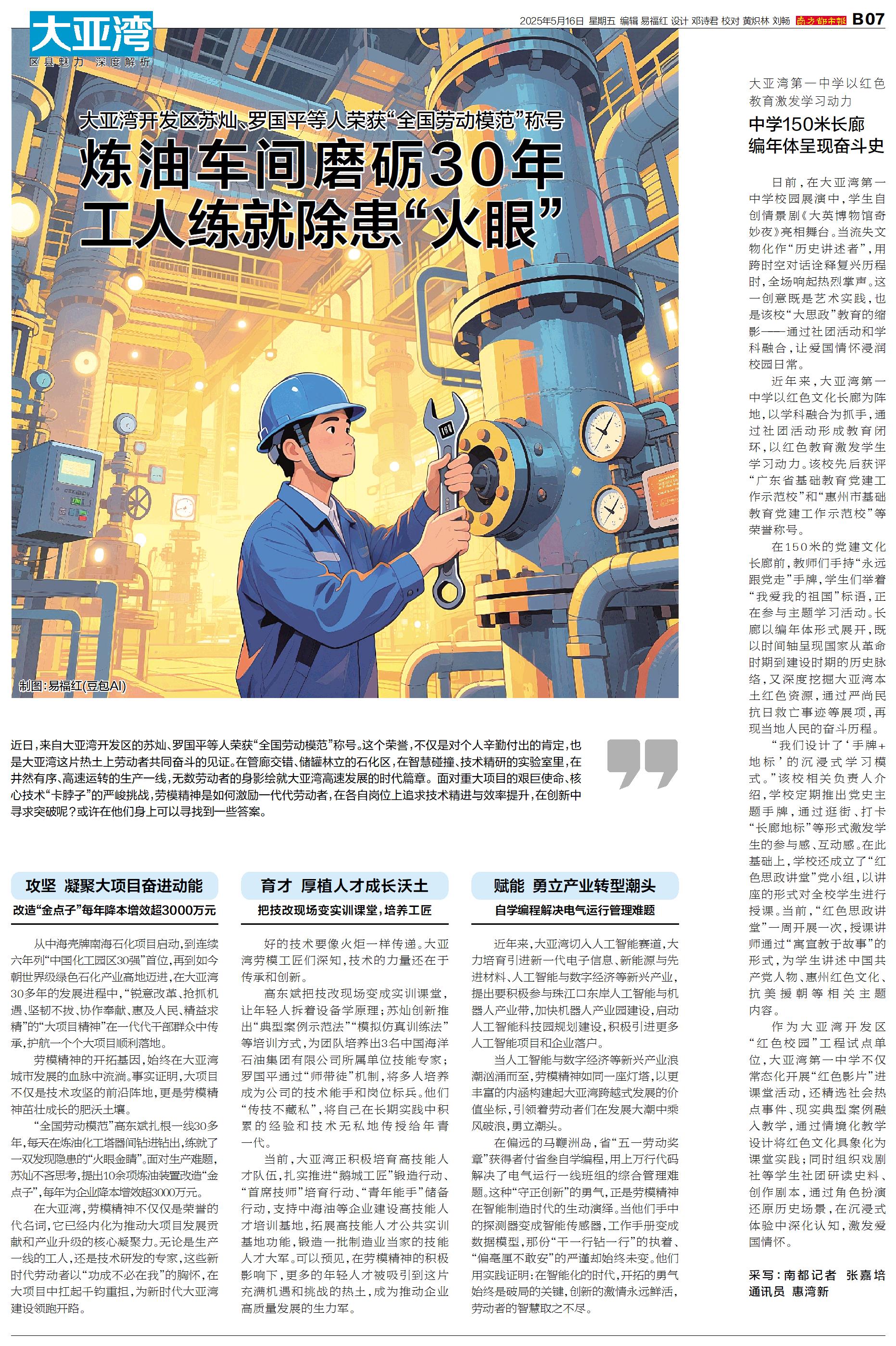 近日,来自大亚湾开发区的苏灿、罗国平等人荣获“全国劳动模范”称号。这个荣誉,不仅是对个人辛勤付出的肯定,也是大亚湾这片热土上劳动者共同奋斗的见证。在管廊交错、储罐林立的石化区,在智慧碰撞、技术精研