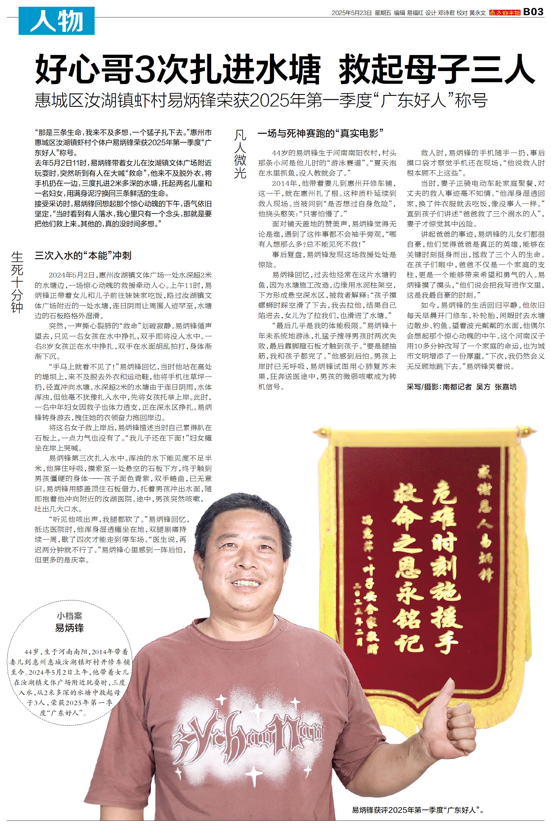 小档案 易炳锋 44岁,生于河南南阳,2014年带着妻儿到惠州惠城汝湖镇虾村开修车铺至今。2024年5月2日上午,他带着女儿在汝湖镇文体广场附近玩耍时,三度入水,从2米多深的水塘中救起母子