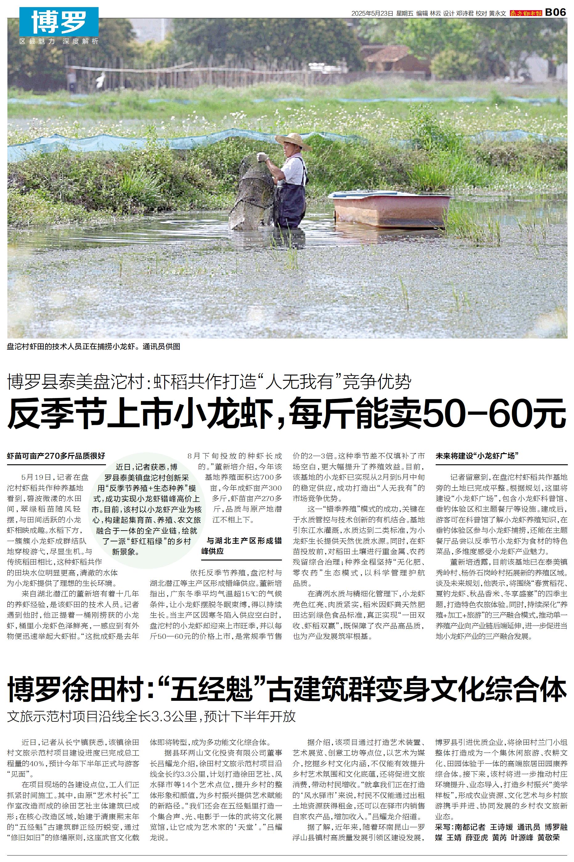 近日,记者获悉,博罗县泰美镇盘沱村创新采用“反季节养殖+生态种养”模式,成功实现小龙虾错峰高价上市。目前,该村以小龙虾产业为核心,构建起集育苗、养殖、农文旅融合于一体的全产业链,绘就了一派“虾红稻