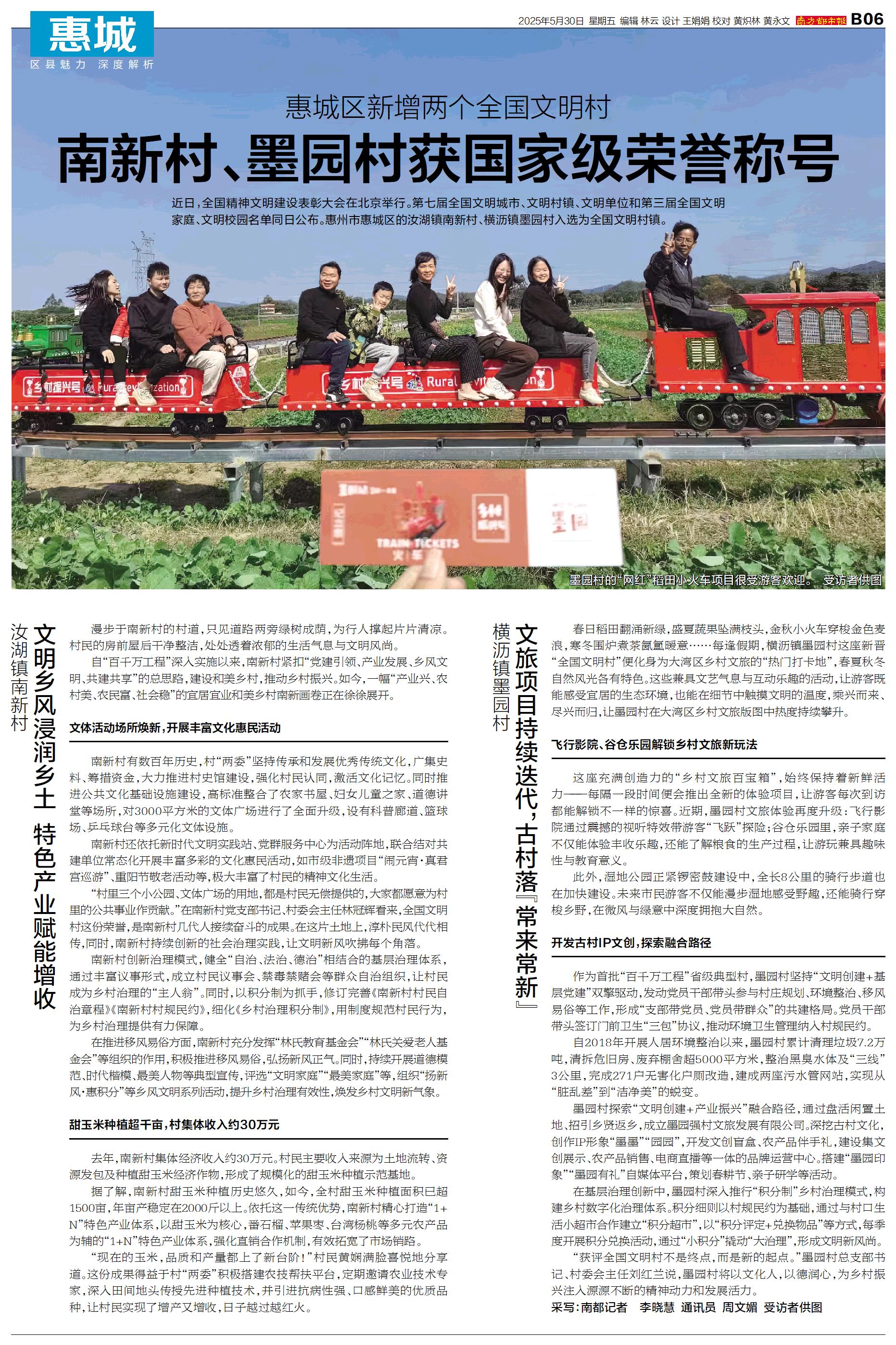 近日,全国精神文明建设表彰大会在北京举行。第七届全国文明城市、文明村镇、文明单位和第三届全国文明家庭、文明校园名单同日公布。惠州市惠城区的汝湖镇南新村、横沥镇墨园村入选为全国文明村镇。 汝湖镇南