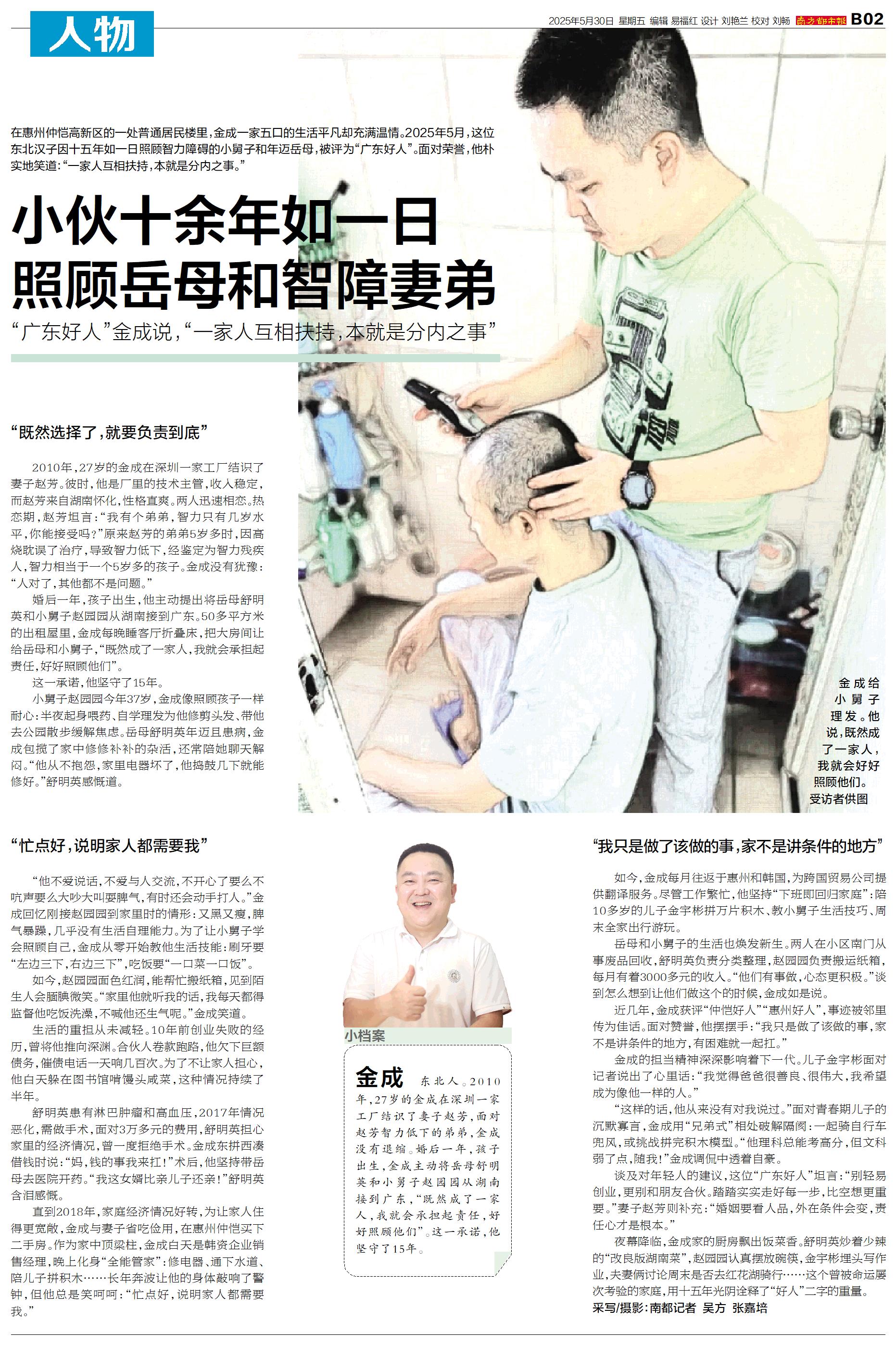 小档案 金成 东北人。2010年,27岁的金成在深圳一家工厂结识了妻子赵芳,面对赵芳智力低下的弟弟,金成没有退缩。婚后一年,孩子出生,金成主动将岳母舒明英和小舅子赵园园从湖南接到广东,“既然成了