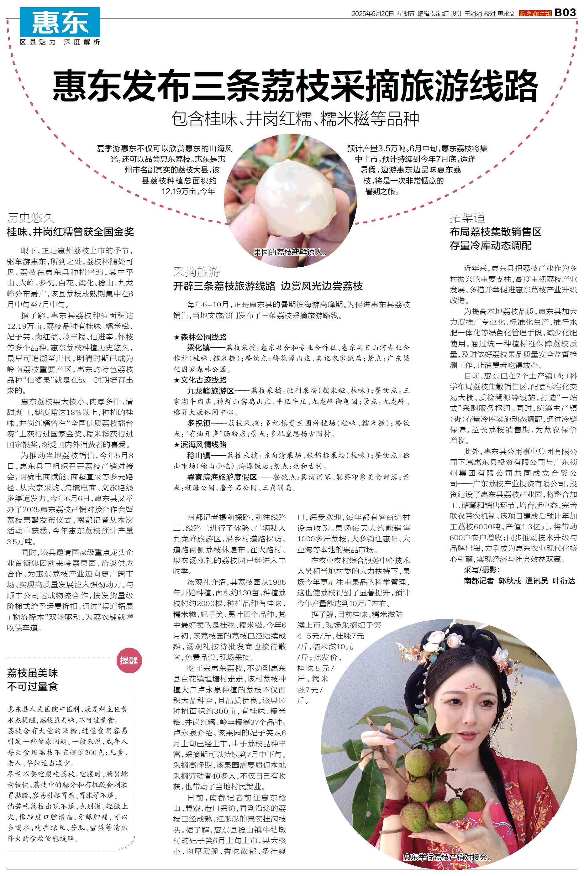 夏季游惠东不仅可以欣赏惠东的山海风光,还可以品尝惠东荔枝。惠东是惠州市名副其实的荔枝大县,该县荔枝种植总面积约12.19万亩,今年预计产量3.5万吨。6月中旬,惠东荔枝将集中上市,预计持续到今年7